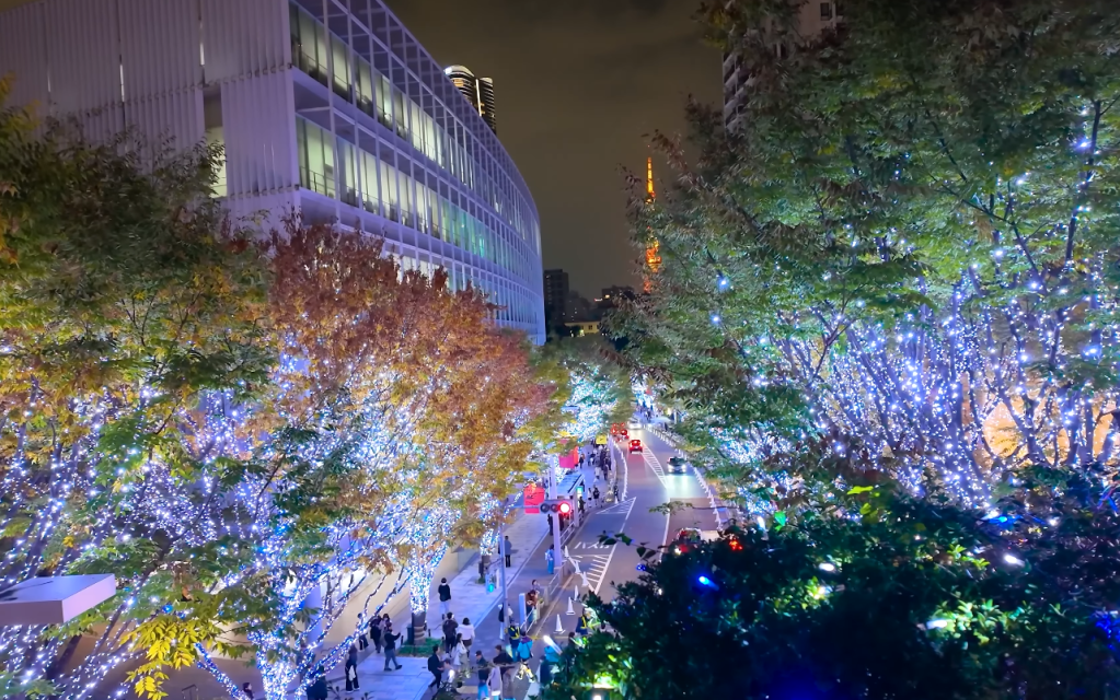 Dès la mi-novembre et jusqu’à la fin décembre, voire début janvier selon les lieux, de grandes artères et des espaces emblématiques s’illuminent. À Marunouchi, le long de l’avenue bordant la gare de Tokyo, des centaines d’arbres sont enveloppés de LED dorées, créant une atmosphère élégante et feutrée qui contraste avec l’architecture moderne des immeubles de bureaux. À Roppongi, les illuminations associent art contemporain et scénographies lumineuses, avec des installations évolutives qui renouvellent chaque année l’expérience des promeneurs.