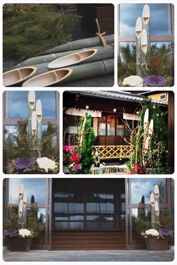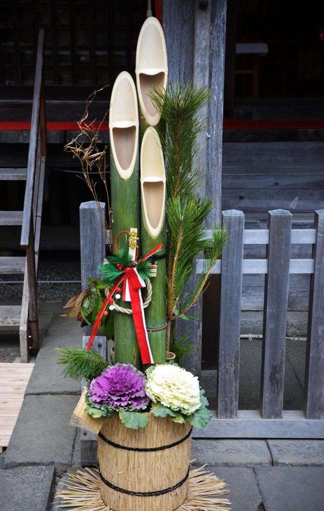 La décoration la plus emblématique est sans conteste le kadomatsu. Placé de part et d’autre des portes d’entrée, il est traditionnellement composé de tiges de bambou coupées en biseau, associées à des branches de pin et parfois à des fleurs, des prunes (ume) ou des fougères.
