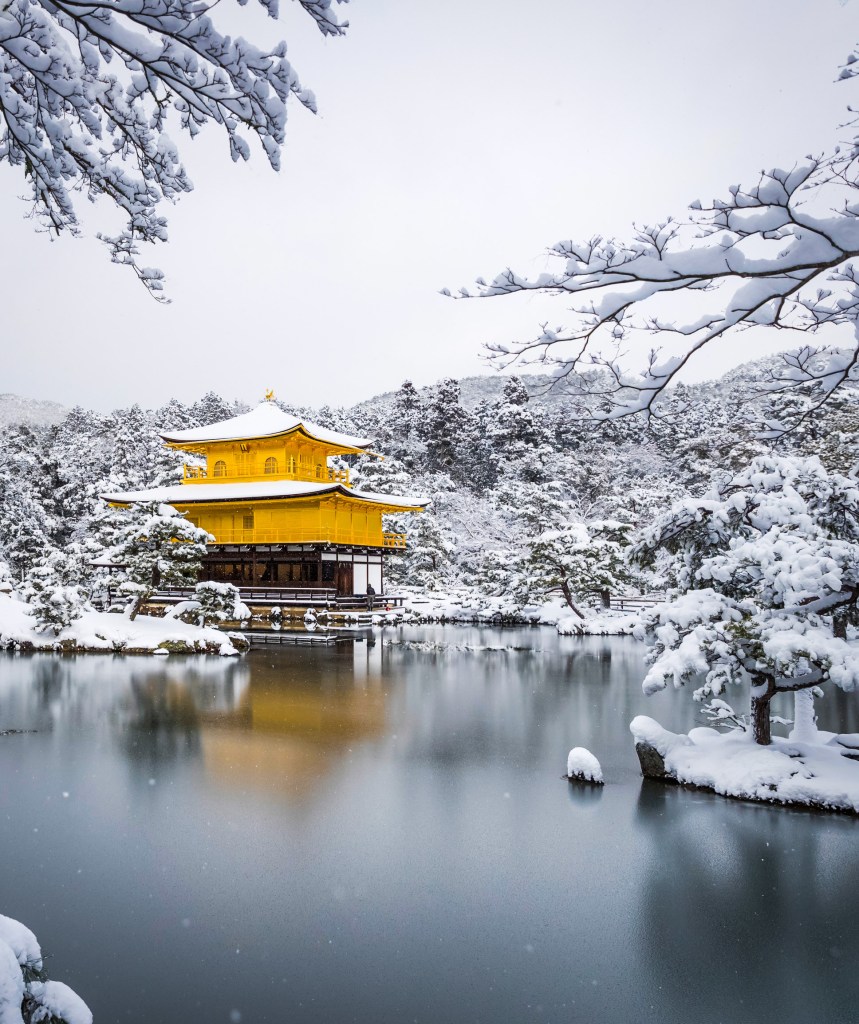 En hiver, lorsque la neige recouvre doucement Kyoto, le Kinkaku-ji, offre l’un de ses visages les plus poétiques. Entouré par l’étang Kyōko-chi, le pavillon semble flotter dans le silence hivernal. Les pins enneigés et les pierres du jardin zen accentuent l’harmonie entre nature et architecture, chère à l’esthétique japonaise. Le froid de l’hiver renforce la sérénité du lieu, invitant à la contemplation et au recueillement.
