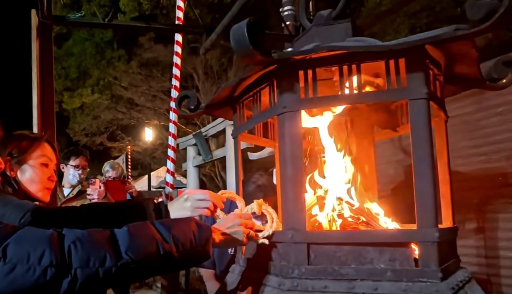 Cette flamme incarne la purification de l’année écoulée et la protection accordée à celle qui commence. Autour, des milliers de fidèles attendent leur tour, serrés les uns contre les autres, dans une organisation patiente et presque instinctive. Chacun tient un long cordon torsadé. À l’approche du feu, un prêtre shinto guide le geste : l’extrémité du cordon est passée à la flamme d’une lanterne allumée au feu sacré. En quelques secondes, le cordon s’embrase. Les participants repartent alors en le faisant tournoyer pour maintenir la combustion, protégeant la flamme du vent et de l’humidité. L’objectif est simple et hautement symbolique : rapporter ce feu jusqu’à son foyer.