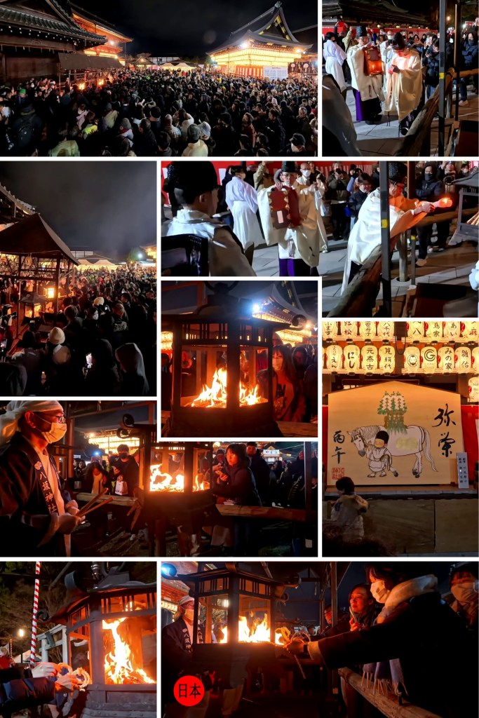 Le soir du 31 décembre, au centre du sanctuaire se déroule Okera-mairi, une cérémonie shinto propre à Yasaka et profondément ancrée dans l’histoire de Kyoto. Les prêtres y entretiennent l’okera-bi, un feu sacré allumé à partir de bois rituellement consacrés.