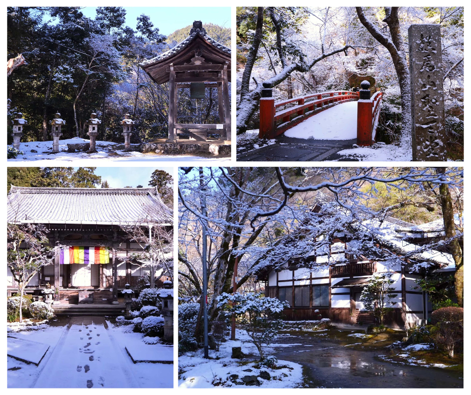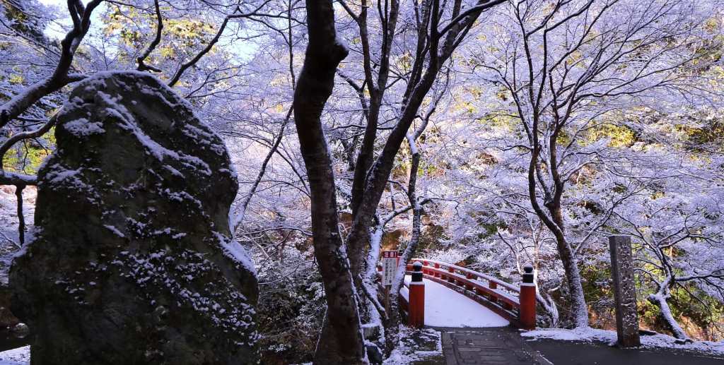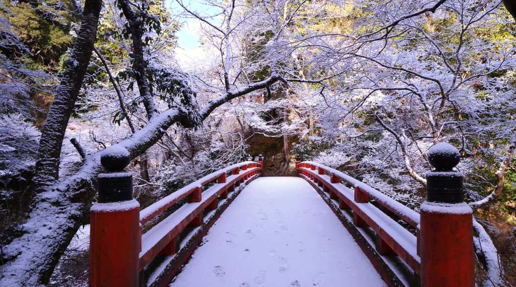 En hiver, la région offre plusieurs fois par an des paysages enneigés qui transforment le temple et ses alentours. Les toitures en bois, les escaliers et le pont vermillon se détachent alors sur le blanc immaculé, créant des contrastes saisissants, il révèlent la sobriété et l’harmonie de l’architecture traditionnelle.