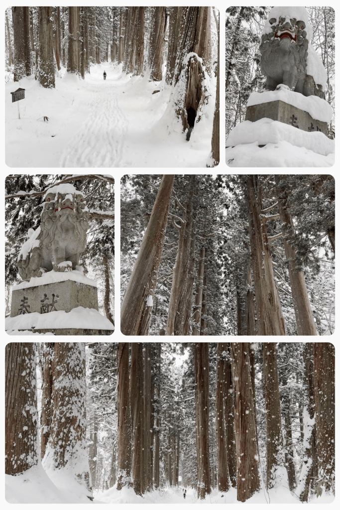 Le chemin s’étire sur près de deux kilomètres à travers une forêt dense. Sa partie la plus emblématique est une longue allée bordée de cèdres géants, plantés il y a plusieurs siècles. Ces arbres monumentaux, hauts de plus de trente mètres, forment un passage solennel vers le sanctuaire. Sous la neige, leurs silhouettes sombres contrastent avec le blanc immaculé du sol.