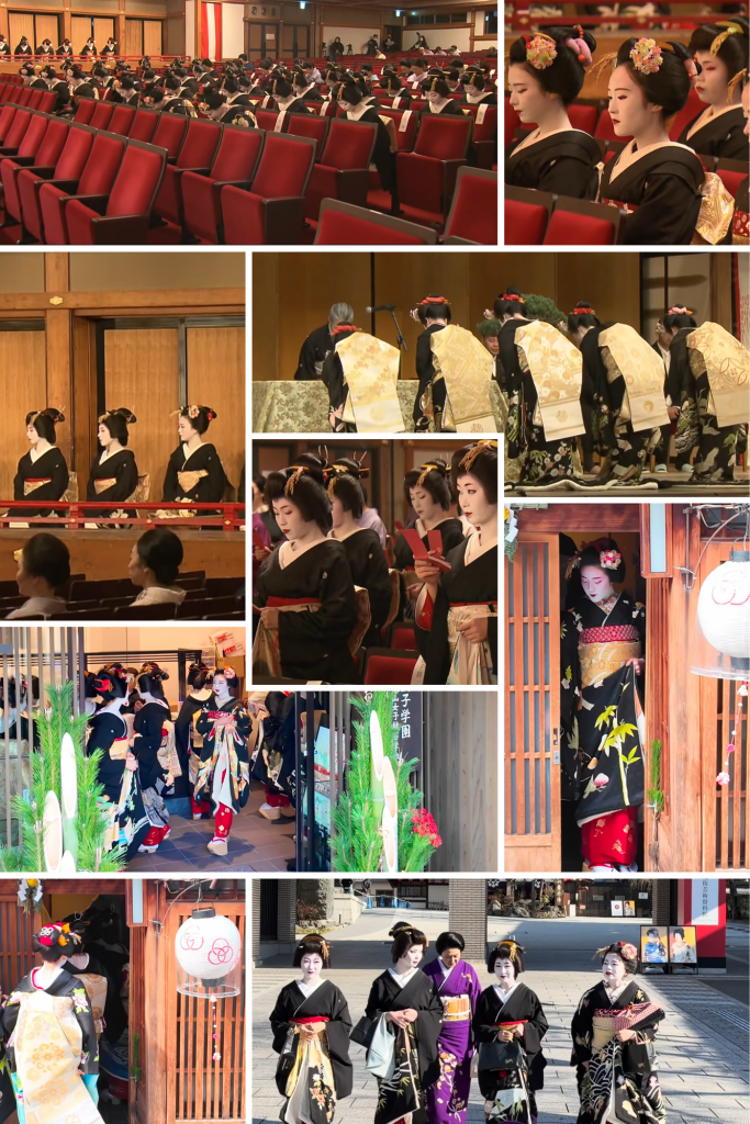 Vêtues de somptueux kimonos noirs ornés de la crête traditionnelle, les geiko et maiko ont renouvelé leur engagement envers leur art lors des cérémonies d’ouverture du Nouvel An, organisées mercredi dans quatre des cinq quartiers historiques de geiko, appelés kagai, de Kyoto : Gion Kobu, Miyagawacho, Pontocho et Gion Higashi.