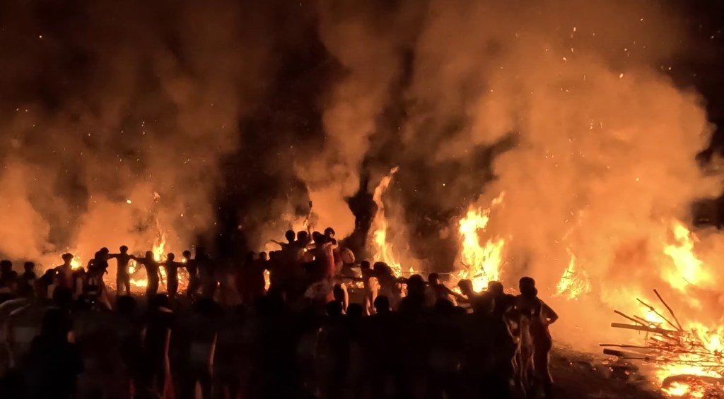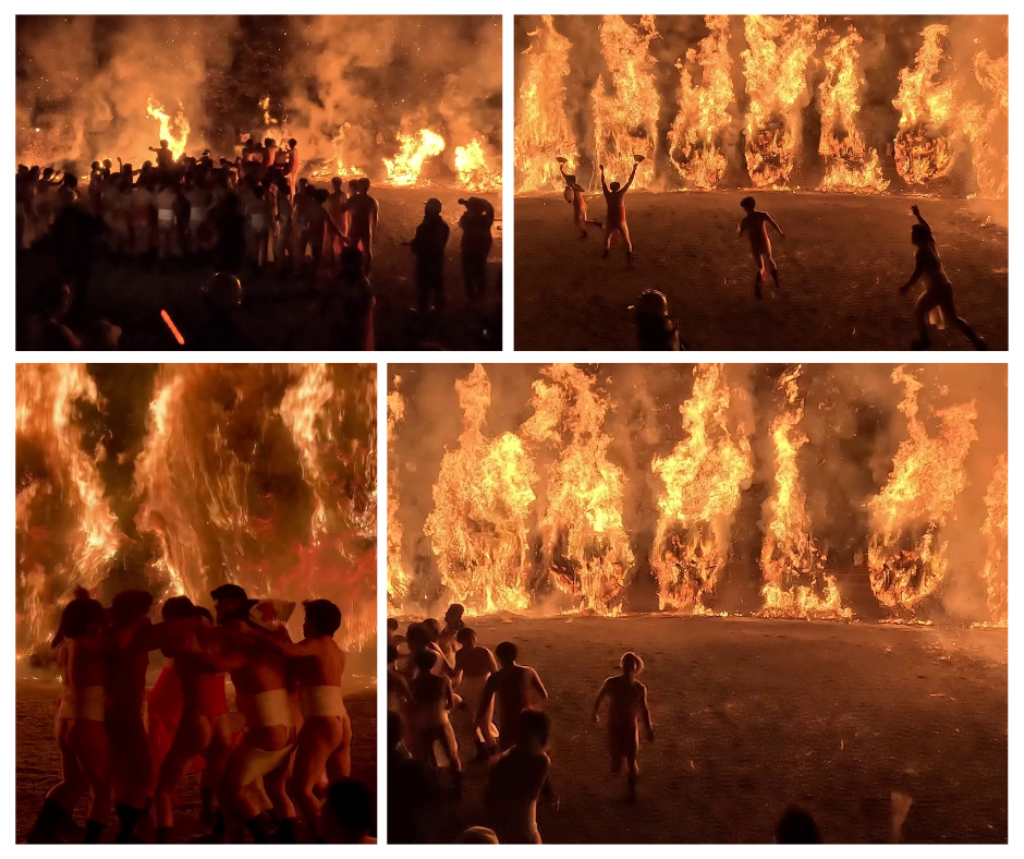 Au pied des flammes dansantes, de jeunes participants vêtus de tenues traditionnelles japonaises ont exécuté des danses rituelles avec énergie et précision. Leurs mouvements, transmis de génération en génération, accompagnaient l’élévation des flammes dans la nuit, créant une atmosphère à la fois solennelle et festive.