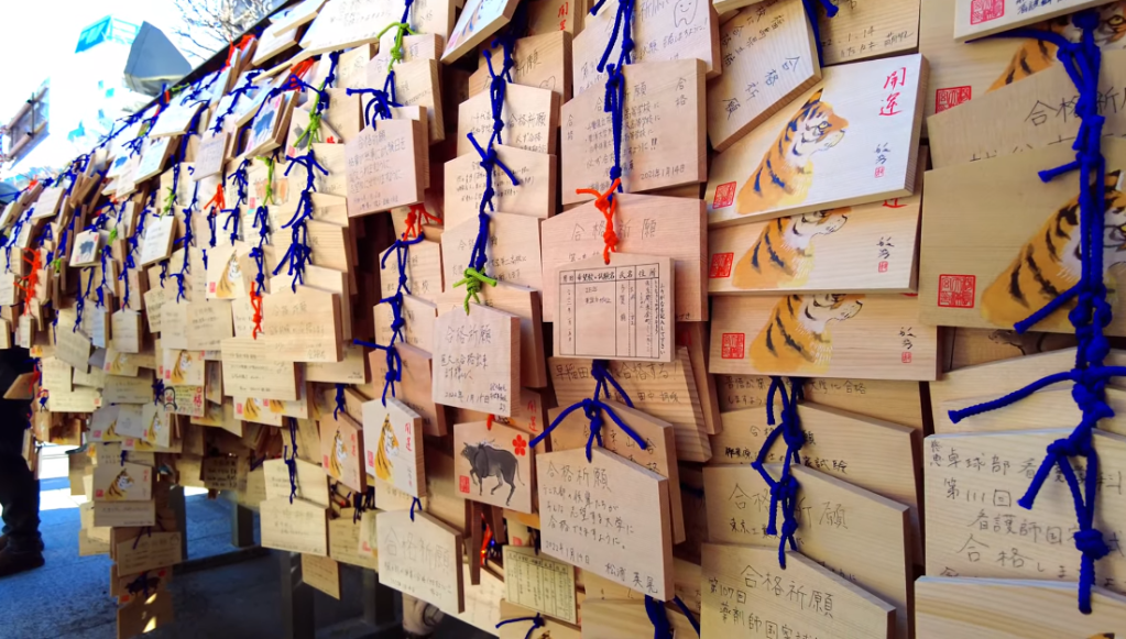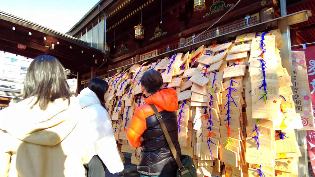 À l’intérieur de l’enceinte, des centaines de plaques de bois ema sont suspendues, couvertes de messages écrits à la main. On peut y lire des prières simples mais chargées d’émotion, telles que « Je prie pour réussir l’examen d’entrée » ou encore « Je veux intégrer l’école de mon choix ». Certains visiteurs achètent également des amulettes porte-bonheur, censées favoriser la concentration et la réussite scolaire.