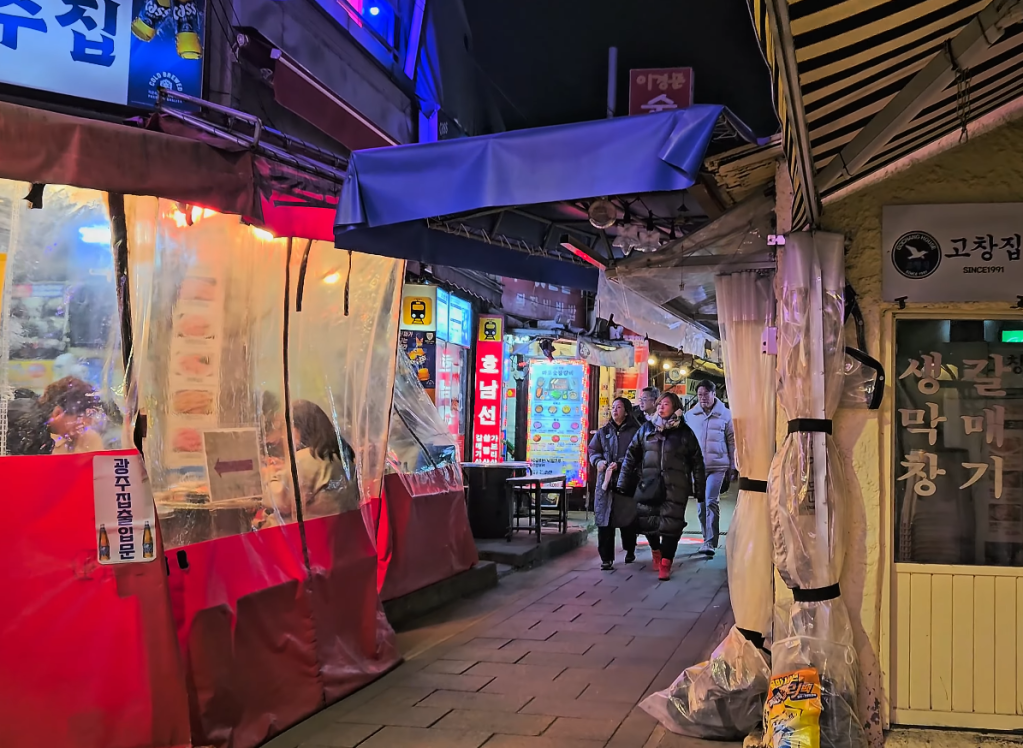 Le soir, Jongno devient un lieu de rencontres intergénérationnelles. Employés sortant du bureau, étudiants, habitués du quartier et visiteurs curieux s’y côtoient sans distinction. Malgré la modernité omniprésente de Séoul, ces restaurants sous bâches incarnent une forme de résistance culturelle, un attachement à une convivialité urbaine que les tours de verre n’ont pas effacée.