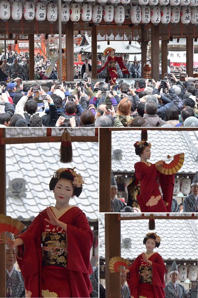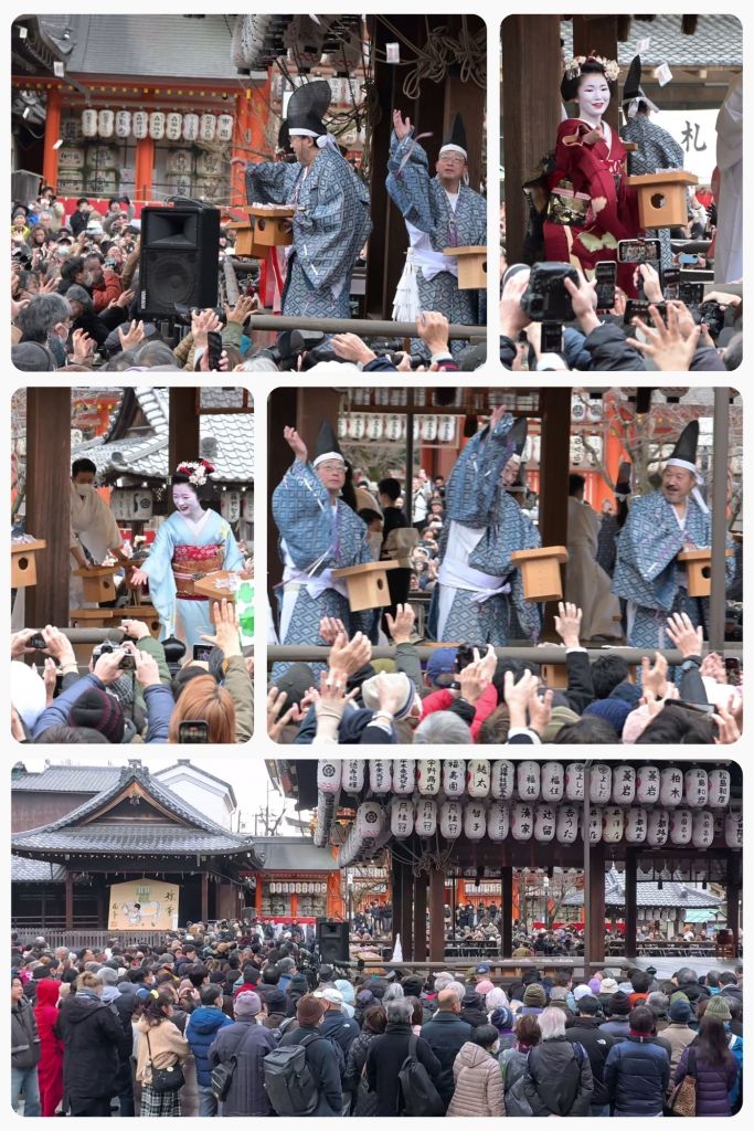 À 13h00, deux maiko du quartier de Pontocho ont offert une danse élégante dans la salle de bal du sanctuaire. Entourées des doyens du sanctuaire, elles ont ensuite procédé au lancer de petits sachets de haricots. Dans une ambiance joyeuse et animée, les participants, Japonais comme visiteurs étrangers, se sont empressés de les attraper, espérant ainsi s’attirer bonheur et prospérité pour l’année à venir. Ce rituel s’inscrit dans la célébration de Setsubun, une fête traditionnelle marquant la transition entre l’hiver et le printemps, durant laquelle les haricots sont lancés pour chasser les mauvais esprits et inviter la chance.