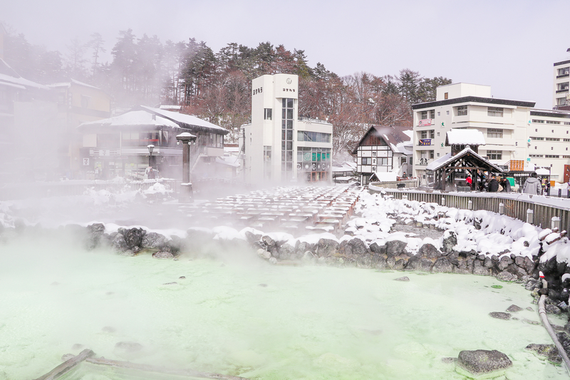 Situé dans la préfecture de Gunma, Kusatsu Onsen est considéré comme l’un des plus célèbres bains thermaux du pays. Nichée en altitude, cette station est réputée pour la richesse et l’acidité de ses eaux, connues pour leurs vertus curatives. Le cœur de Kusatsu bat autour du Yubatake, un impressionnant champ de bois canalisant l’eau brûlante des sources, dont la vapeur enveloppe le village d’une atmosphère presque mystique. Ici, le rituel du yumomi, qui consiste à refroidir l’eau à l’aide de planches en bois sans la diluer, perpétue un savoir-faire ancestral et fait partie intégrante de l’identité locale.