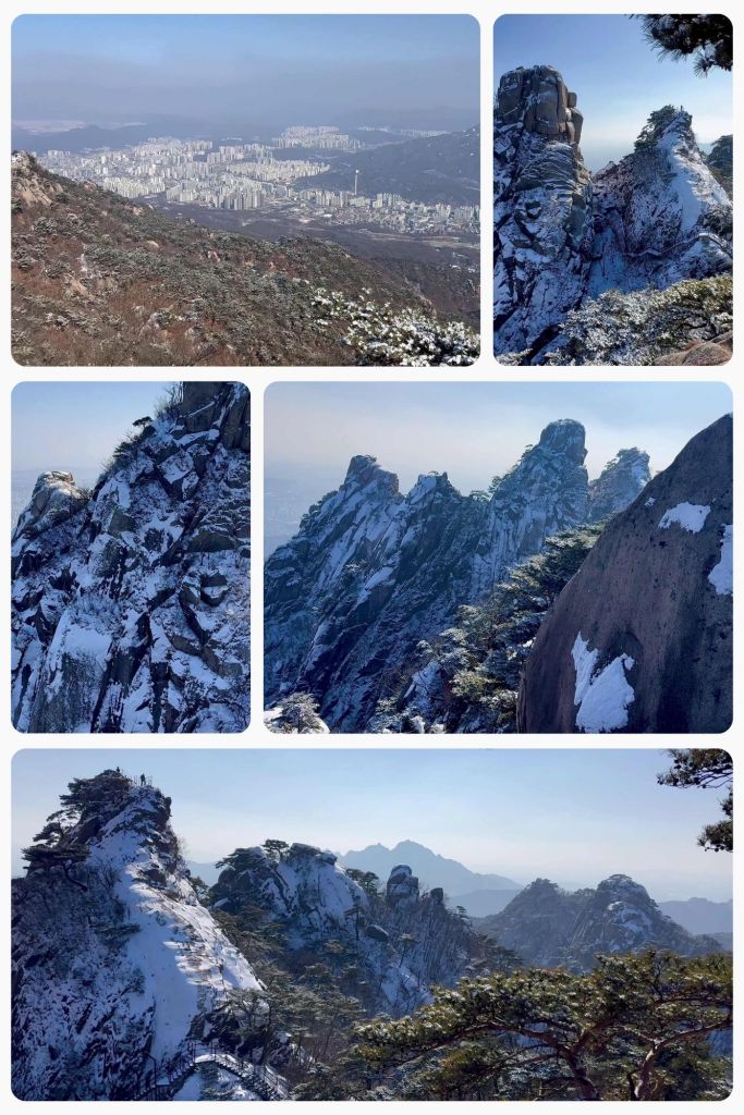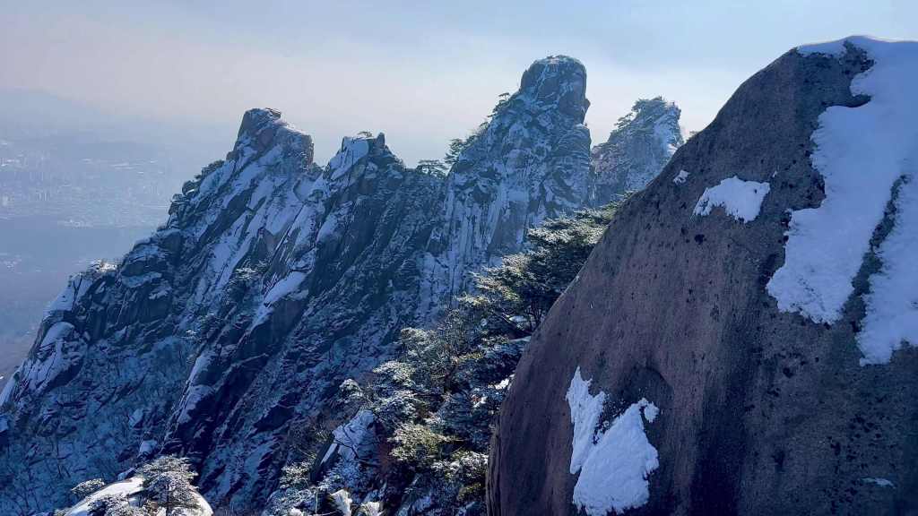 Bukhansan est l’un des parcs nationaux les plus fréquentés de Corée du Sud. En hiver pourtant, l’atmosphère change radicalement. Les sentiers se font plus calmes, les forêts de pins se couvrent de givre. La montagne semble alors appartenir davantage aux randonneurs qu’aux foules urbaines. Les parcours de randonnée sont nombreux et adaptés à différents niveaux. L’ascension vers Baegundae reste la plus emblématique. En hiver, elle exige prudence et équipement adapté, notamment des crampons, car certaines portions rocheuses deviennent glissantes. L’effort est largement récompensé par une vue spectaculaire sur Séoul.