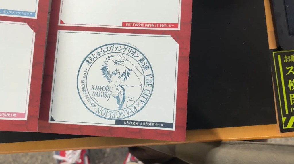 À Ube, le hall d’entrée du bâtiment des échanges citoyens de la mairie a été désigné comme site officiel de pèlerinage. Un tampon commémoratif, à la manière d’un goshuin, y est installé aux côtés de feuilles que les visiteurs peuvent marquer et conserver en souvenir, perpétuant ainsi un rituel typiquement japonais revisité à l’aune de la culture pop. Si la ville attire autant l’attention, c’est aussi parce qu’elle est le berceau de Hideaki Anno, le créateur et réalisateur d’Evangelion. Depuis 2021, la municipalité organise un événement annuel dédié à la franchise, transformant Ube en véritable vitrine de l’univers de la série. Au programme : foires gastronomiques thématiques, ventes de produits dérivés et animations spéciales.