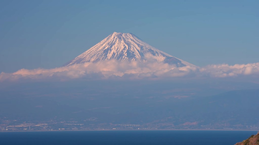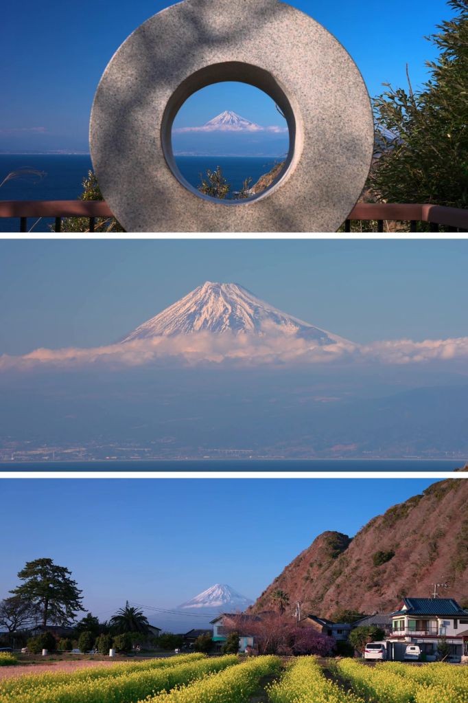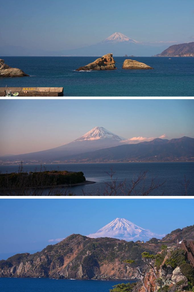 À Izu, le mont Fuji n’est jamais tout à fait le même. Tantôt majestueux et éclatant sous la neige hivernale, tantôt rosé à l’aube, tantôt mystérieux derrière un voile de nuages, il dialogue avec la mer et les falaises. La péninsule devient alors un immense balcon naturel, où chaque point de vue raconte une nouvelle histoire de la montagne sacrée.