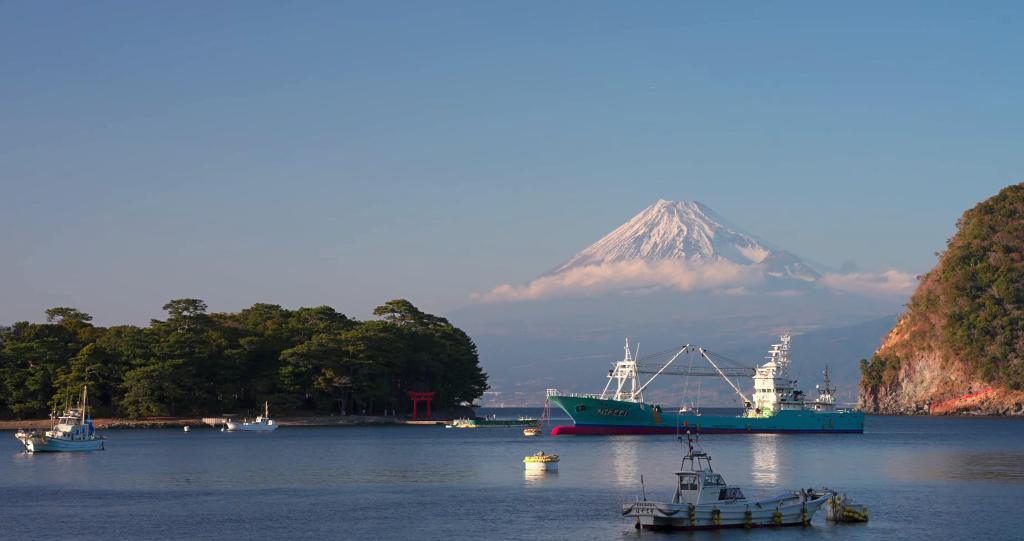 Sur la côte ouest, la petite ville de pêcheurs de Heda, dans la municipalité de Numazu, est réputée pour sa vue emblématique : au coucher du soleil, la silhouette presque parfaite du Fuji se reflète dans les eaux calmes de la baie de Suruga. Les barques colorées au premier plan composent une image d’estampe, particulièrement prisée des photographes. Un peu plus au sud, les caps escarpés et les plages de Dogashima offrent des panoramas saisissants où la montagne semble flotter au-dessus de l’horizon maritime.