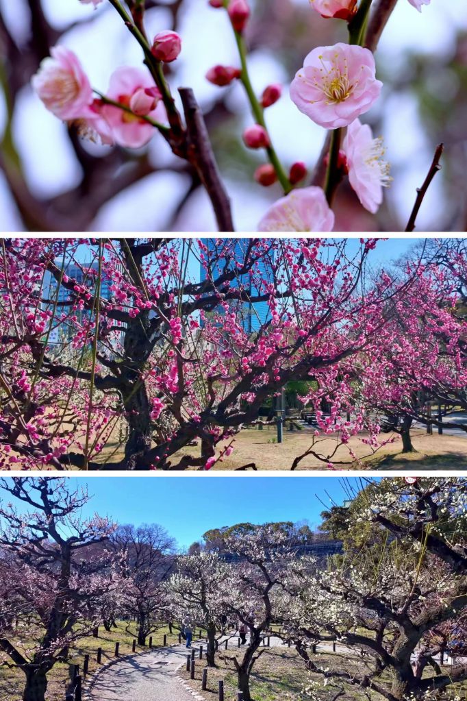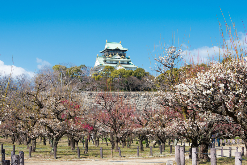 Chaque année, entre février et mars, les pruniers en fleurs annoncent l’arrivée prochaine du printemps dans le parc du Château d’Osaka. Avant même la floraison des cerisiers, près d’un millier de pruniers déploient leurs pétales blancs, roses ou rouge soutenu dans le jardin qui leur est consacré, au sud-ouest de l’enceinte principale.