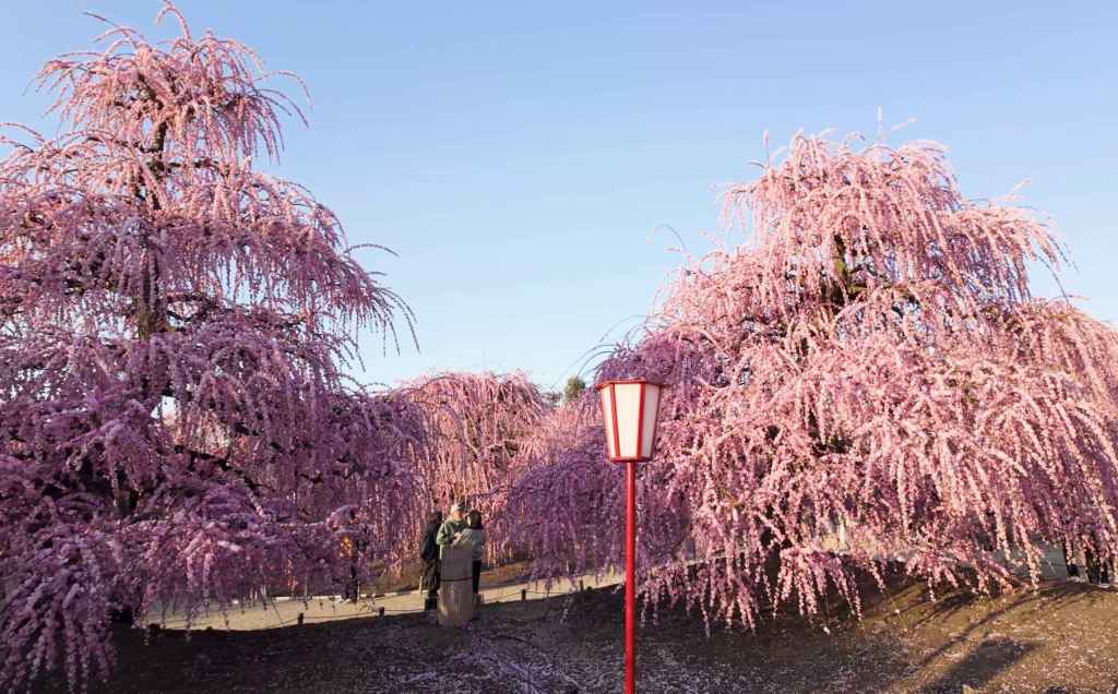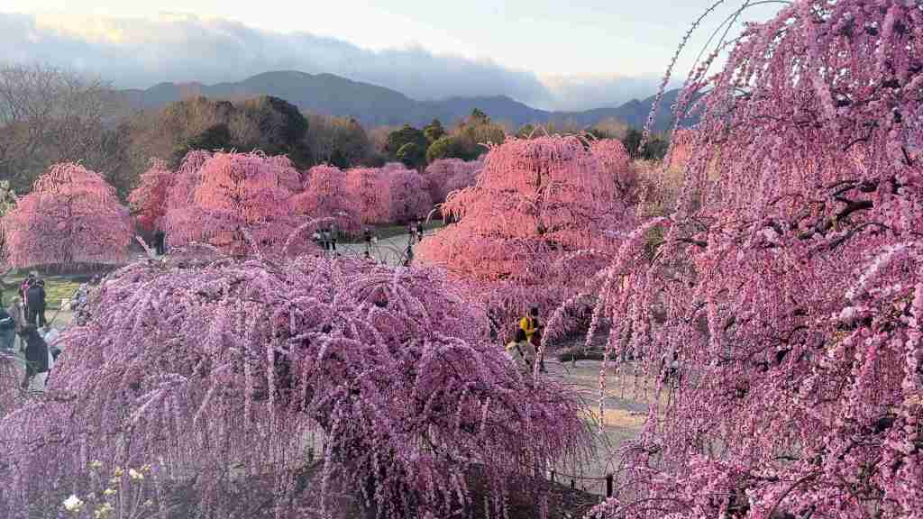 Situé dans la ville de Suzuka, le Suzuka Forest Garden est devenu au fil des années l’un des lieux les plus prisés pour admirer les ume shidare, ces pruniers pleureurs aux branches arquées qui retombent en longues traînes fleuries. Ici, les arbres semblent se pencher vers les visiteurs comme pour les inviter à entrer dans un monde suspendu.