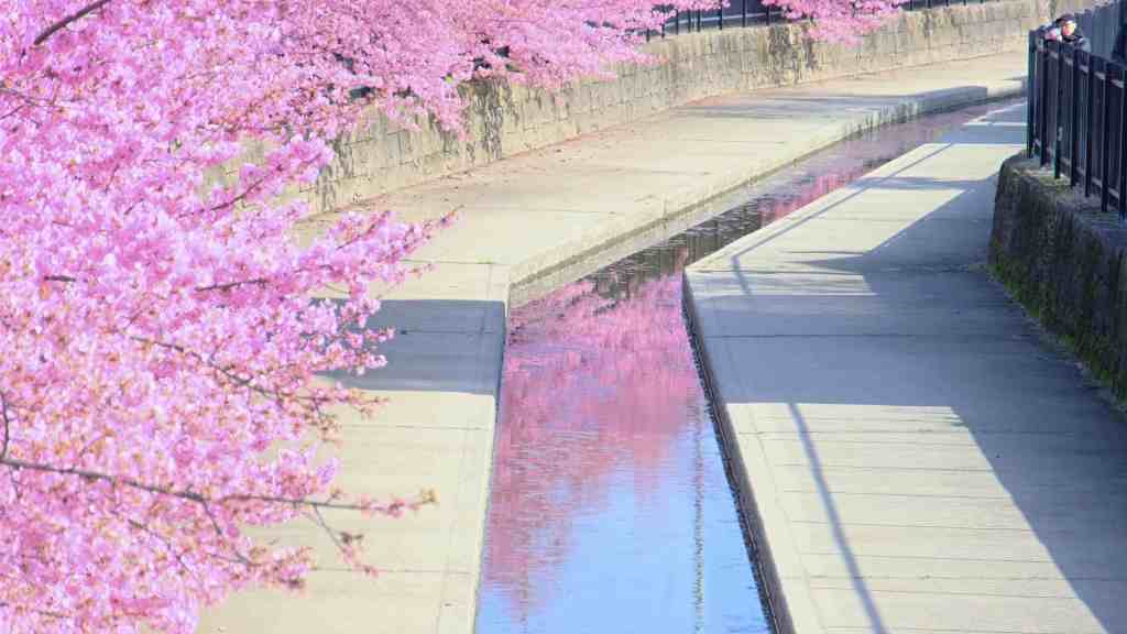 Mais ce qui fait la renommée du canal Yodo dépasse largement sa fonction d’origine. Sur près d’un kilomètre, des centaines de cerisiers ont été plantés le long de ses rives. Au printemps, lorsque les fleurs de sakura éclosent, le canal se transforme en couloir rose et blanc. Les branches se penchent au-dessus de l’eau, créant une voûte florale qui se reflète à la surface. Le spectacle devient particulièrement saisissant lorsque les pétales commencent à tomber. Ils glissent sur l’eau et forment un tapis flottant, un phénomène que les Japonais appellent hana ikada, littéralement “radeau de fleurs”. Le courant lent du canal emporte alors ces milliers de pétales dans un mouvement silencieux.