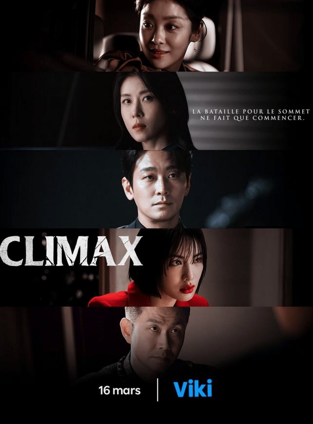 Mais alors que l’opération prend de l’ampleur, l’affaire se complique dangereusement. Tae Seop découvre que sa propre épouse, Chu Sang A — ancienne actrice adulée — pourrait dissimuler des secrets lourds de conséquences. Entre ambitions, trahisons et jeux de pouvoir, CLIMAX promet une montée en tension haletante où personne n’est vraiment digne de confiance.