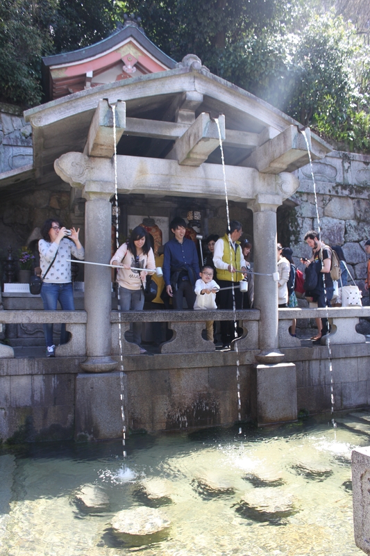 Au pied du temple jaillit la cascade d’Otowa, dont les trois filets d’eau symbolisent respectivement la longévité, la réussite scolaire et l’amour. Les visiteurs viennent y boire à l’aide de louches pour attirer la bénédiction correspondant à leur souhait, bien que la tradition conseille de ne choisir qu’un seul vœu pour éviter de paraître trop ambitieux.