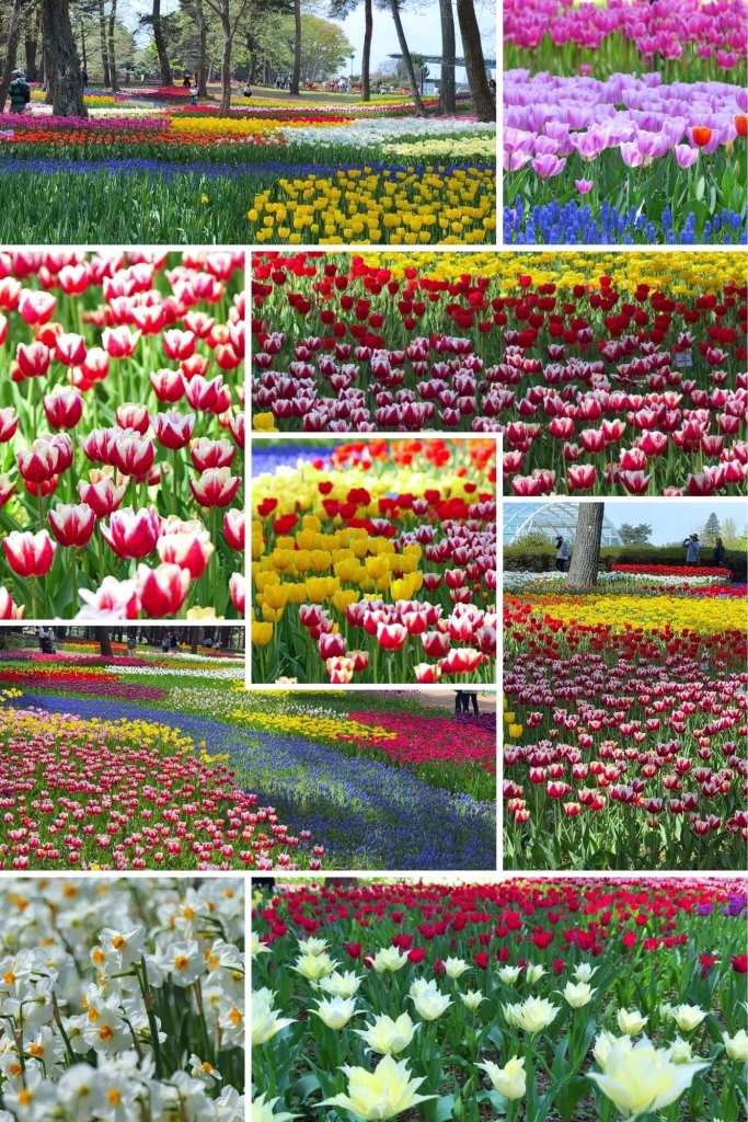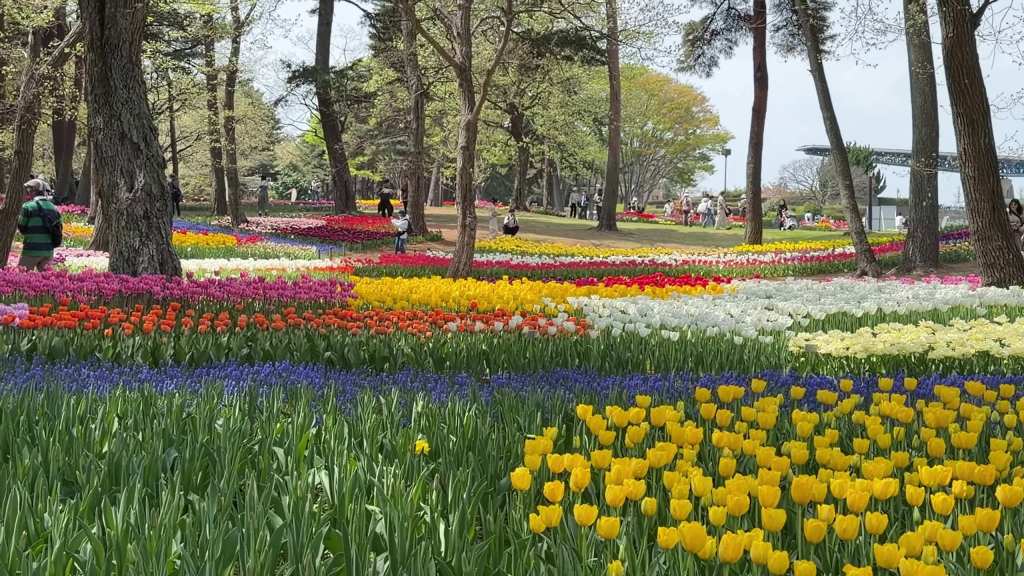 Sur les collines ondulantes de Miharashi, des millions de némophiles, surnommées « baby blue eyes », recouvrent le paysage d’un tapis azur presque irréel. Cette floraison, qui atteint généralement son apogée en avril, transforme le parc en une mer bleutée bercée par le vent marin. À quelques pas de là, des champs de tulipes aux teintes vives rouges, jaunes, roses et violettes, composent un contraste éclatant, elles apportent une touche de chaleur et de diversité à ce décor déjà spectaculaire.