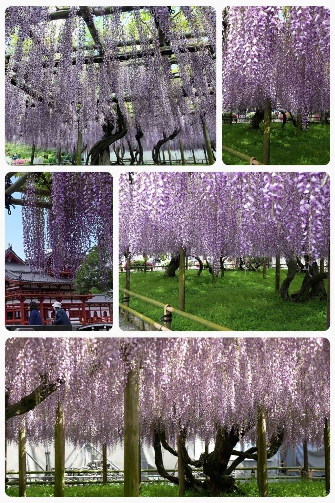 Chaque année, entre la mi-avril et le début du mois de mai, les longues grappes violettes de cette plante grimpante transforment les abords du temple en un tableau vivant. Suspendues comme des cascades florales, elles oscillent doucement au gré du vent, diffusant un parfum subtil. La glycine du Byōdō-in, parfois âgée de plus de 280 ans, est considérée comme l’une des plus remarquables du Japon.